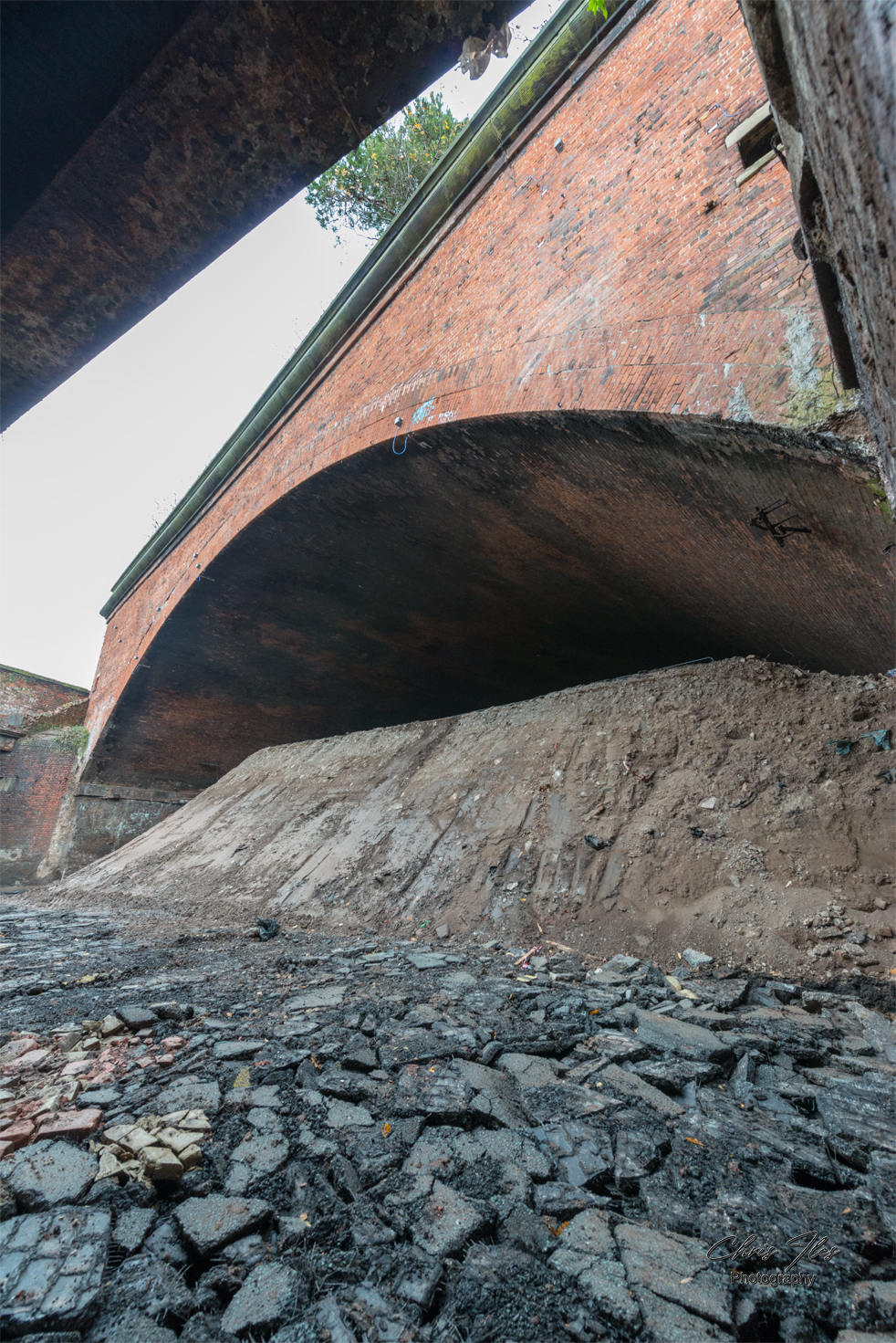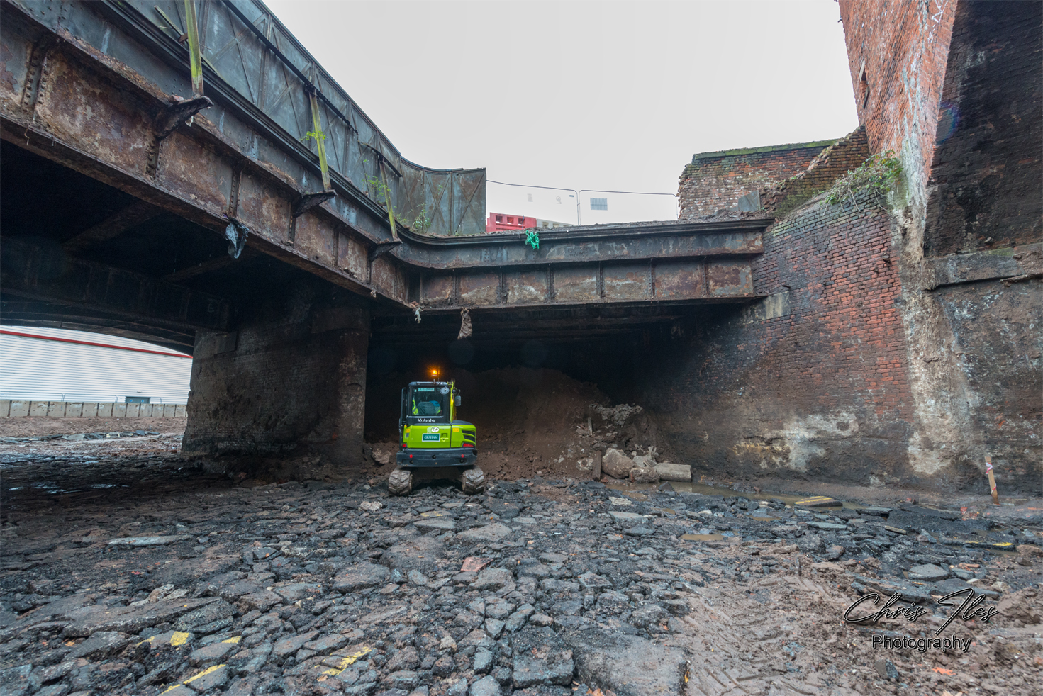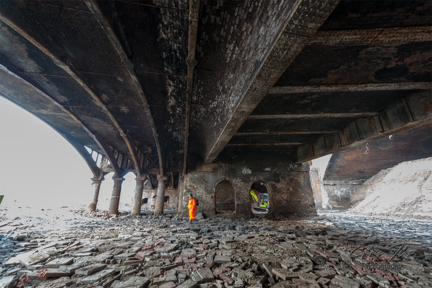 I was given site access to photograph the original metal structure of the Great Howard Street road Bridge (A565), given that the bridge’s structure had been revealed, after being buried for safety reasons for many years. However, this work to reveal the structure of the bridge was sadly in preparation for it’s demolition. The original bridge was constructed by Robert Daglish and Co of St Helens, having a total span of 166ft and being formed of 4 ribs, supported centrally by cast iron columns. The iron bridge was later widened with a steel girder bridge section, which allowed the road to be widened. The original bridge has now sadly been demolished and replaced by a new concrete bridge.