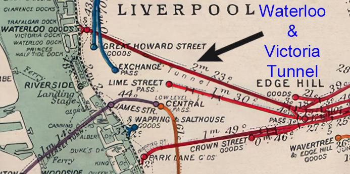 A ‘Railway Clearing House map’, dated 1909, shows the Old Railways of Liverpool with a closeup of the section detailing the long disused, Waterloo and Victoria Tunnel’s leading to Great Howard Street Goods and Waterloo Goods Yard.