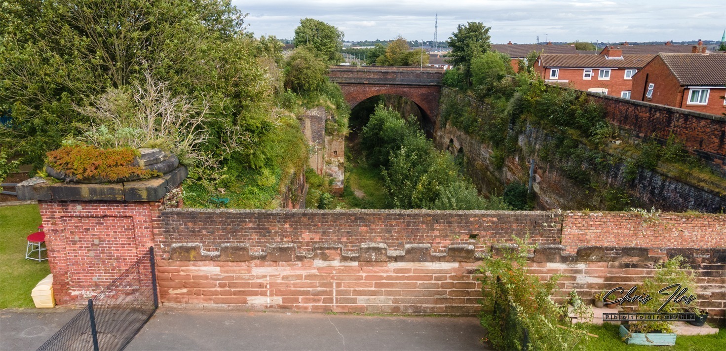 The main chimney, which has long since been demolished, leaves just this square base visible. You can still see where the chimney would have stood and how the inside of the structure has now been taken over by nature. The high drone viewpoint, also gives an interesting view looking down into the historic Wapping Cutting beyond the original 1830 wall in the school yard.
